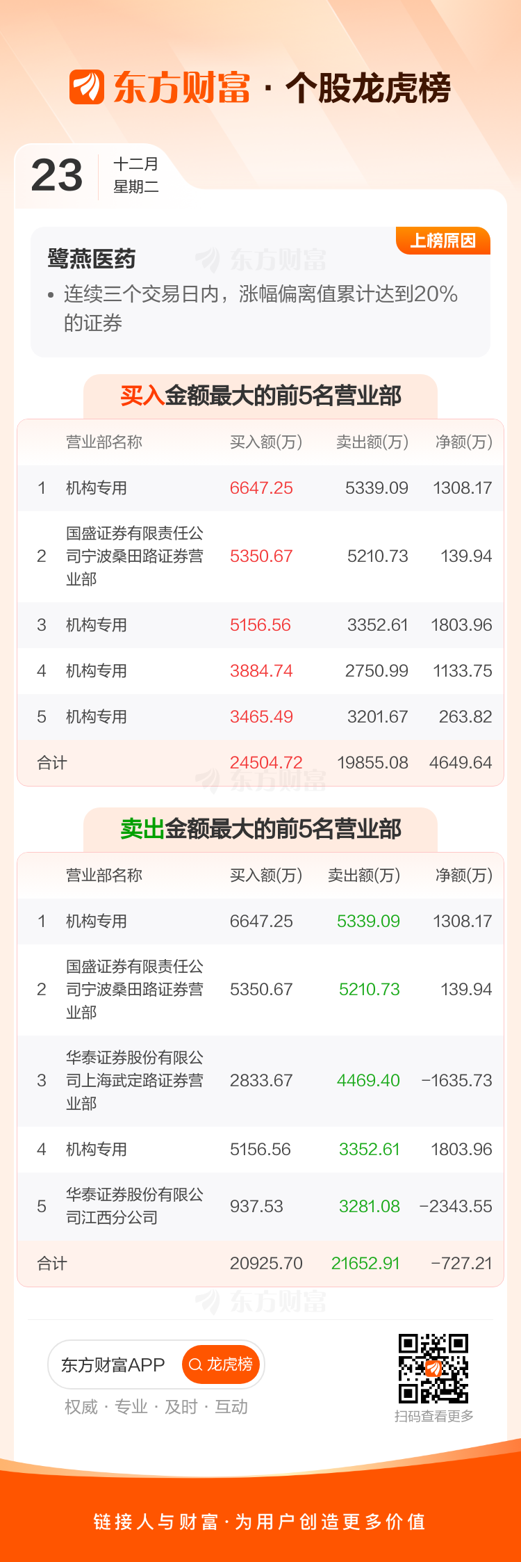 鹭燕医药(002788)龙虎榜数据(12-23)