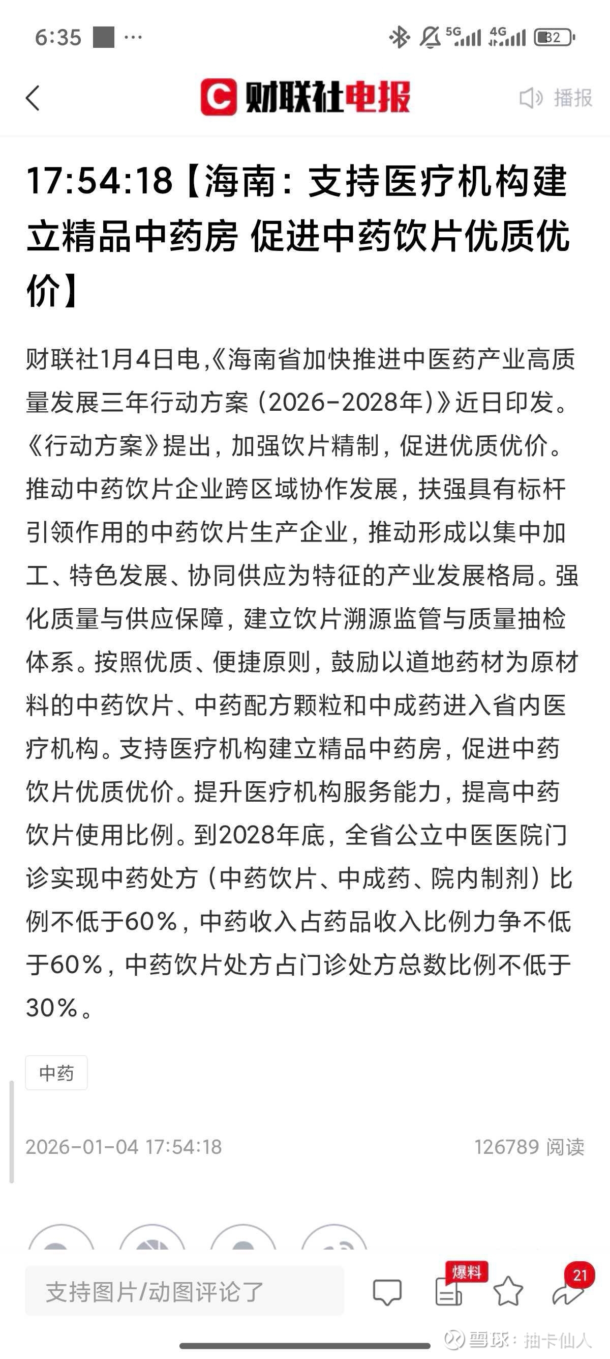 $鹭燕医药(SZ002788)$ 【海南:到2028年底力争中医药全口径产值增长15%】财联社1月4日电,《海南省加快推进中医药产业高质量发展三年行动方案(2026-2028年)》近日印发。《行动方案》提出,到2028年底,培育中药材良种良苗繁育园及“定制药园”10个以上,中药材种植养殖总面积100万亩以上,建成产地分拣加工中心和市县...$鹭燕医药(SZ002788)$