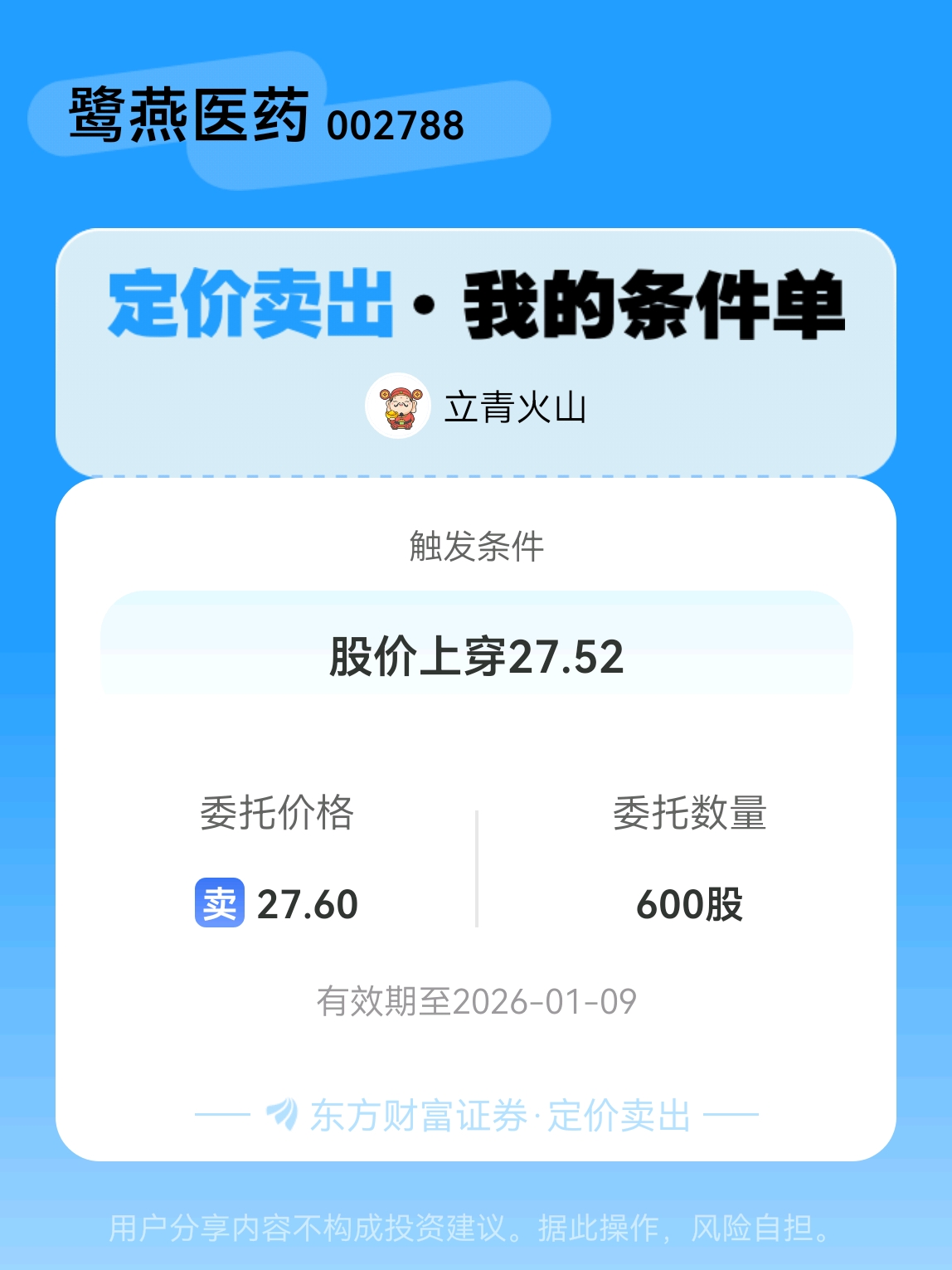 #条件单交流# #定价卖出晒单# 一位股神设置了一个定价卖出条件单,接下来就是见证奇迹的时刻~$鹭燕医药(SZ002788)$