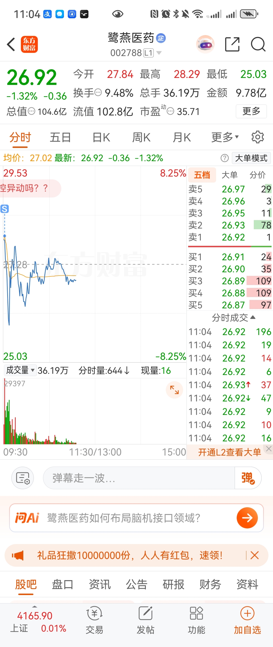 $鹭燕医药(SZ002788)$ 早盘冲高就跑,昨天迟迟不上28,就是诱多