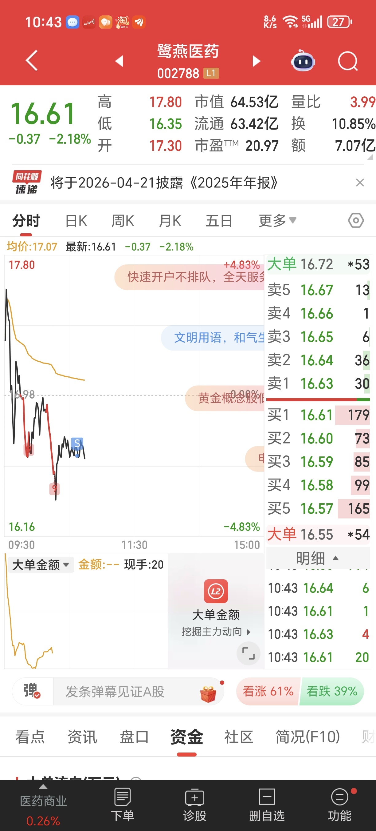$鹭燕医药(SZ002788)$ 先撤退了。我先换回四方达,等站上18.17元再回来。$四方达(SZ300179)$
