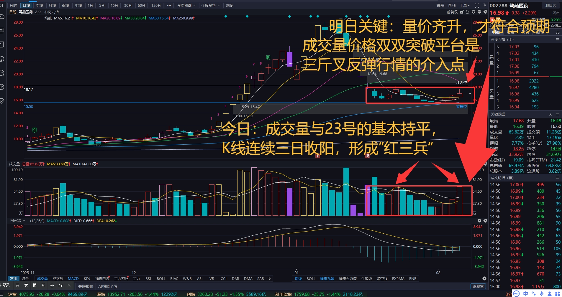 从技术面来看,今天最醒目的是成交量呈现倍量柱站上5日与10日均量线,与1月23日相当,其次是近三日的K线形态呈现出“红三兵”形态。因此,明天唯一预期就是“涨”,否则不及预期,果断离场。
