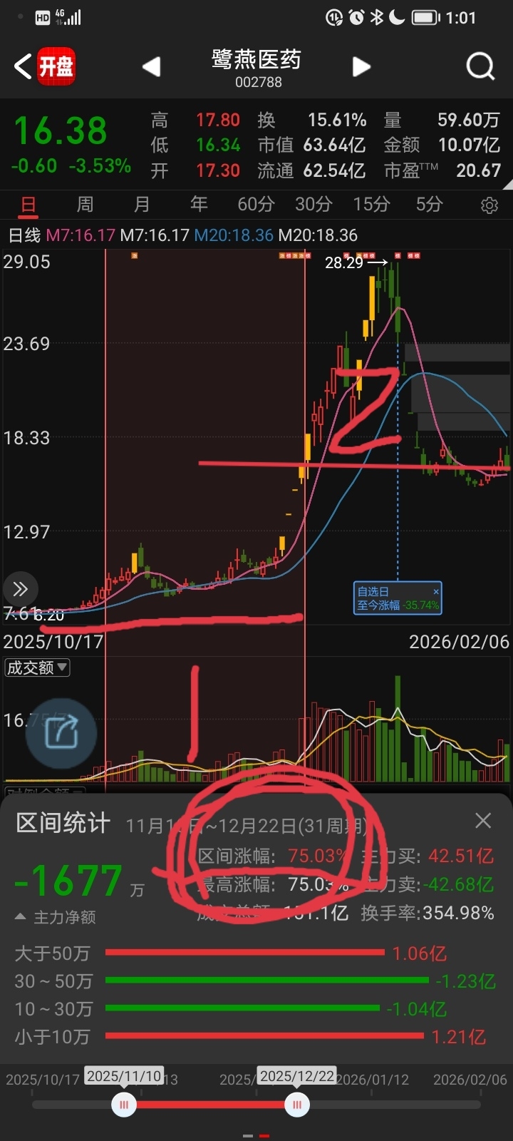 $鹭燕医药(SZ002788)$ 赶快跑,昨天中药这么大的利好,这小子稳不住股价,第一部分筹码开始逃跑了, (这一波上涨,就是平台卖药),公司营业又差,连个像样的反弹都没有,注意我画的1,2,第一部分还有百分之七八十的利润,已经在慢慢兑现了,以前的药,跟现在的药,差距很大,以前吃一盒就好了,现在要吃4,5盒,不上医院,上平台买药,搞笑,(历史数据,这一波上涨有几个涨停?后面都没涨停过)