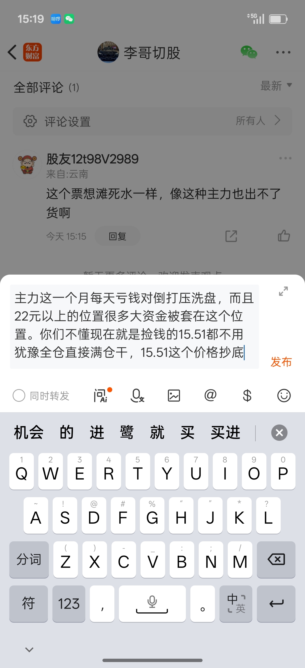 $鹭燕医药(SZ002788)$ 这样的股我做的太多了我从来没有让你们追高买吧,我一直让你们抄底进吧,即使今天我还在提示挂15.51全仓抄底,我可以说我今天15.51彻底满仓进来了。我可以跟任何人说我15.51全仓抄底进来的,你们可以看接下来我能赚多少谁对谁错,很快就会出对错。#强势机会# #复盘记录# #炒股日记# #收盘点评# #实盘记录#