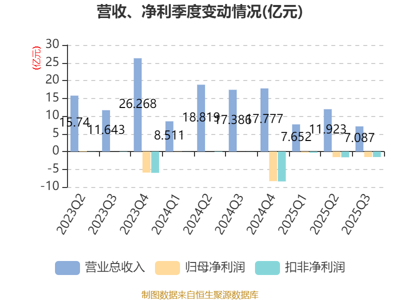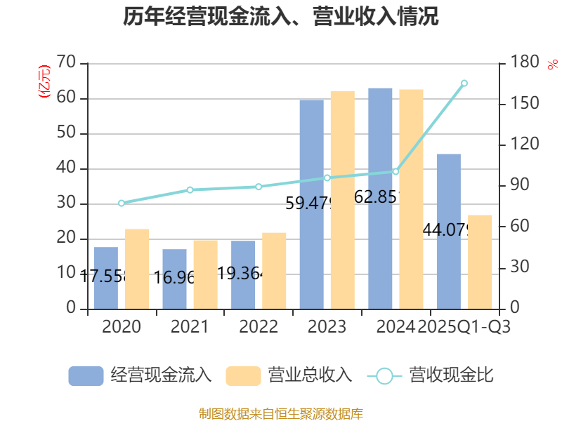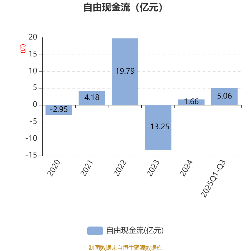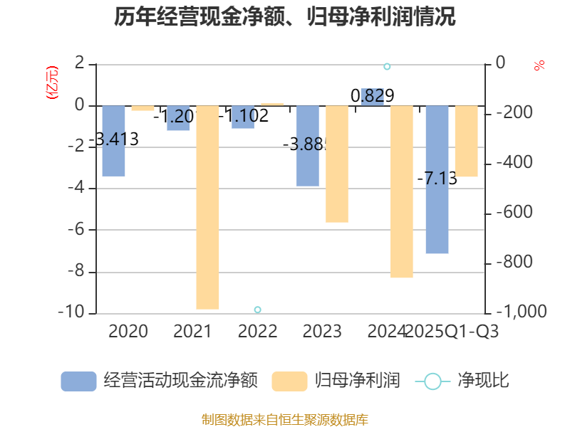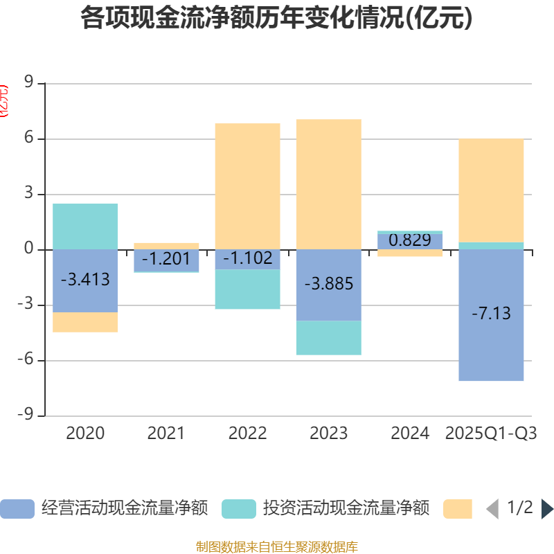 2025年前三季度,公司经营活动现金流净额为-7.13亿元,同比减少6.76亿元;筹资活动现金流净额5.6亿元,同比增加3.16亿元;投资活动现金流净额3896.16万元,上年同期为-1.28亿元。