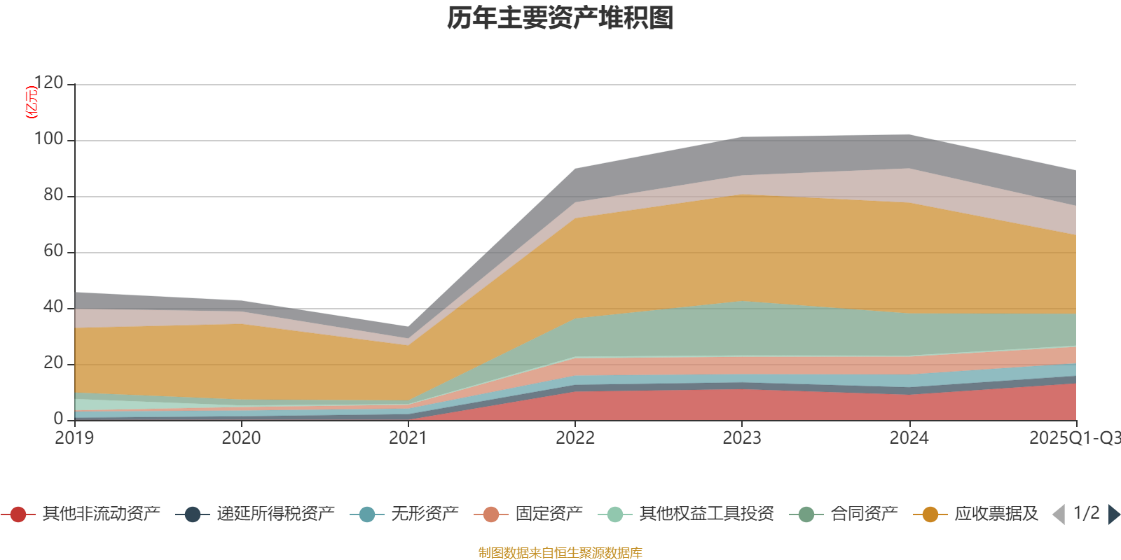 资产重大变化方面,截至2025年三季度末,公司应收票据及应收账款较上年末减少28.91%,占公司总资产比重下降7.26个百分点;其他非流动资产较上年末增加45.05%,占公司总资产比重上升5.82个百分点;合同资产较上年末减少24.09%,占公司总资产比重下降1.95个百分点;无形资产较上年末减少2.33%,占公司总资产比重上升0.52个百分点。