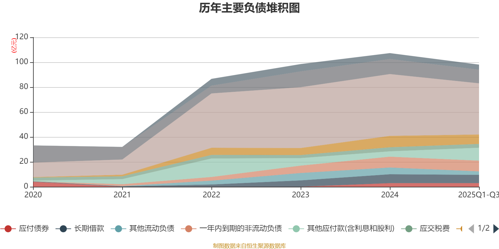 负债重大变化方面,截至2025年三季度末,公司其他应付款(含利息和股利)较上年末增加138.99%,占公司总资产比重上升7.38个百分点;应付票据及应付账款较上年末减少17.25%,占公司总资产比重下降2.61个百分点;其他流动负债较上年末减少48.56%,占公司总资产比重下降2.2个百分点;一年内到期的非流动负债较上年末减少0.58%,占公司总资产比重上升1.16个百分点。