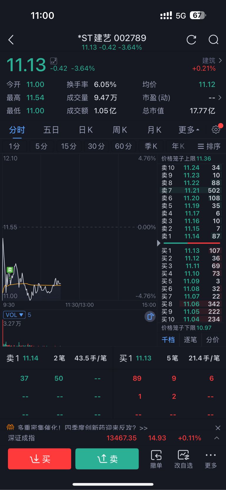 $*ST建艺(SZ002789)$ 说多都是泪,那天打板进,亏了7个点,7k,今天居然红的机会都不给我出。