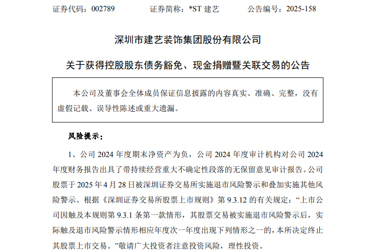 *ST建艺表示,本次债务豁免及现金捐赠的相关事项,将减少公司的债务,相应增加公司资本公积,具体影响金额公司将根据企业会计准则的相关规定进行处理,关于对公司的财务影响需以年度审计结果为准,公司2025年度净资产能否转正尚存在不确定性。截至目前,公司退市风险警示及其他风险警示尚未消除。