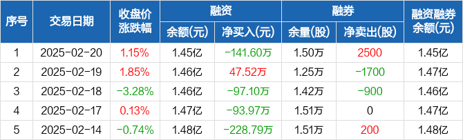 坚朗五金:融资净偿还141.6万元,融资余额1.45亿元(02-20)