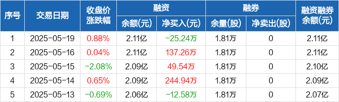 坚朗五金:融资净偿还25.24万元,融资余额2.11亿元(05-19)