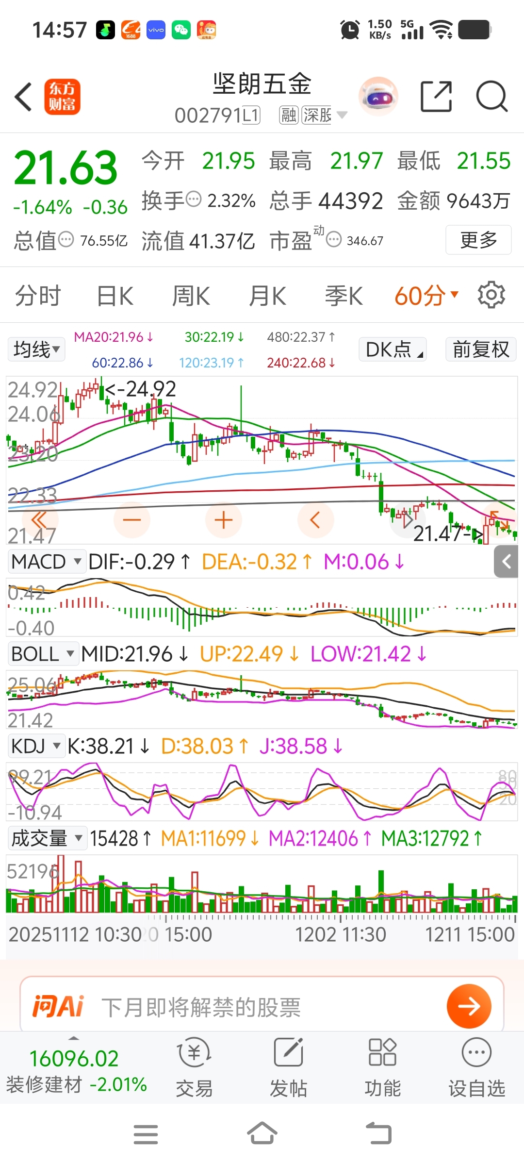 $坚朗五金(SZ002791)$ 兄弟们,明天大概率走60分钟底背离,调动资源明天干它最后一跌,21是破不了的