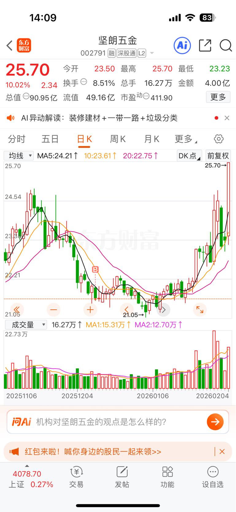 $坚朗五金(SZ002791)$ 19个点了