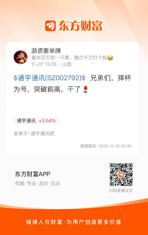 $通宇通讯(SZ002792)$  兄弟们,摔杯为号,突破前高,干了