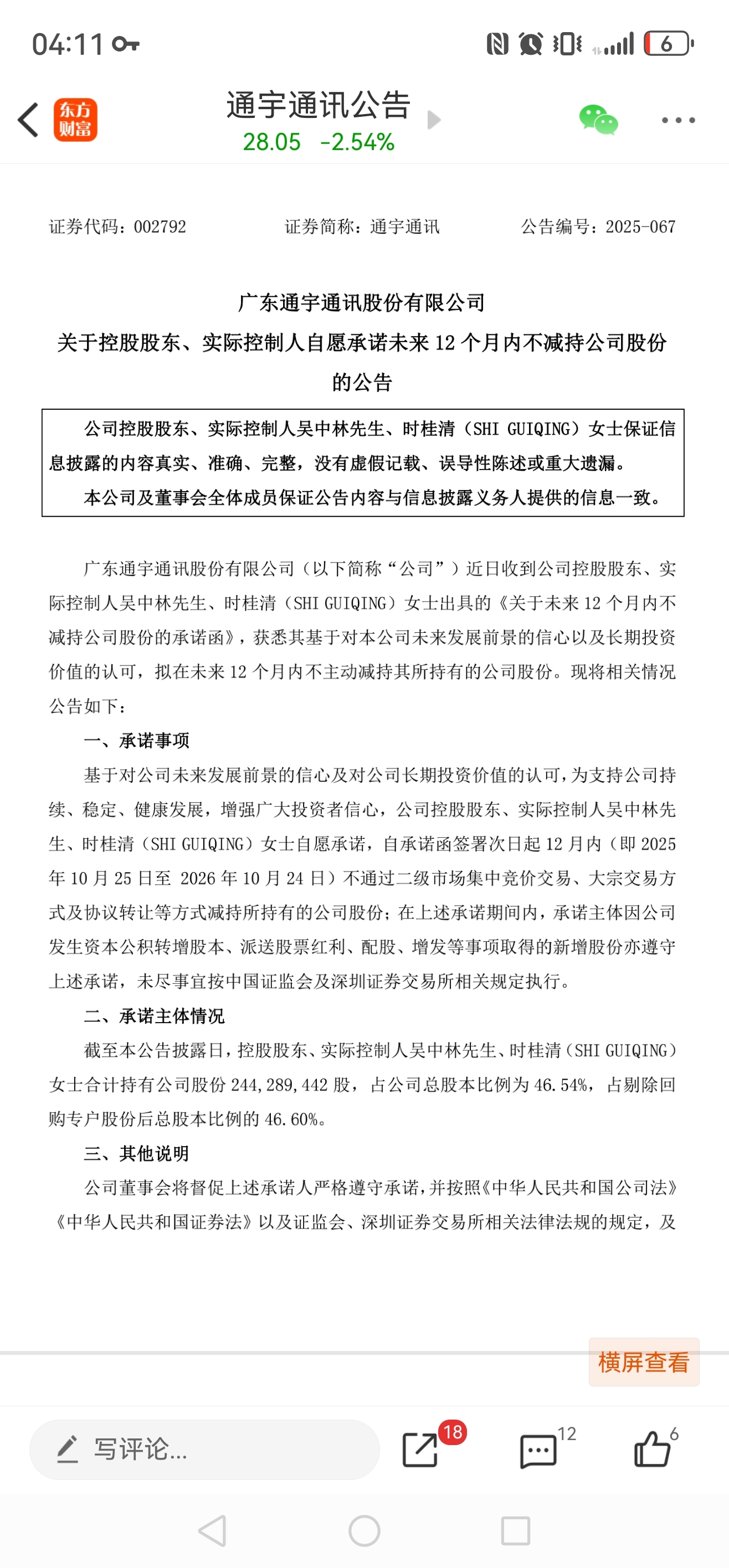 $通宇通讯(SZ002792)$ 给大家打打气吧,公司实际控制人承诺一年不卖股票。