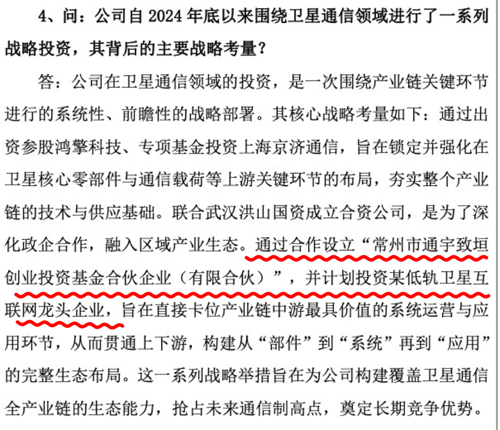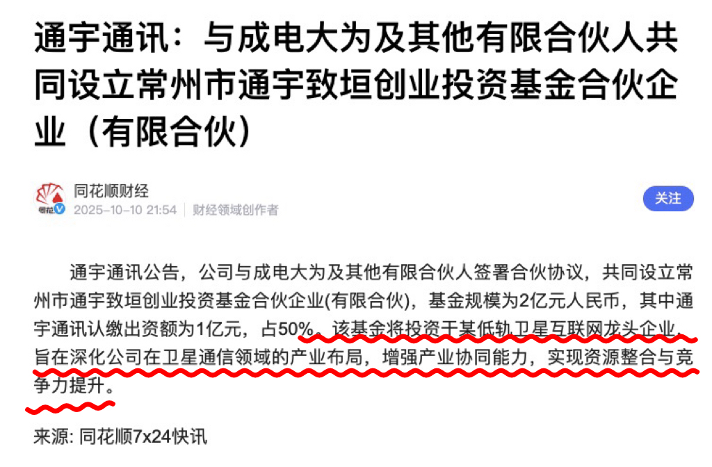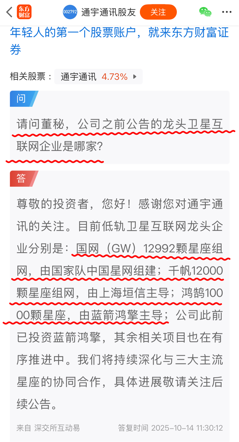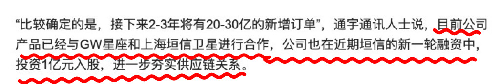 $通宇通讯(SZ002792)$ 别不信,通宇通信投了1亿给上海垣信,又将投1亿给凌空天行,与蓝箭航空一起参股了鸿擎科技,另外公司也是上海垣信和蓝箭航空的卫星通信供应商,今年半年报的卫星通信类营收2602万。