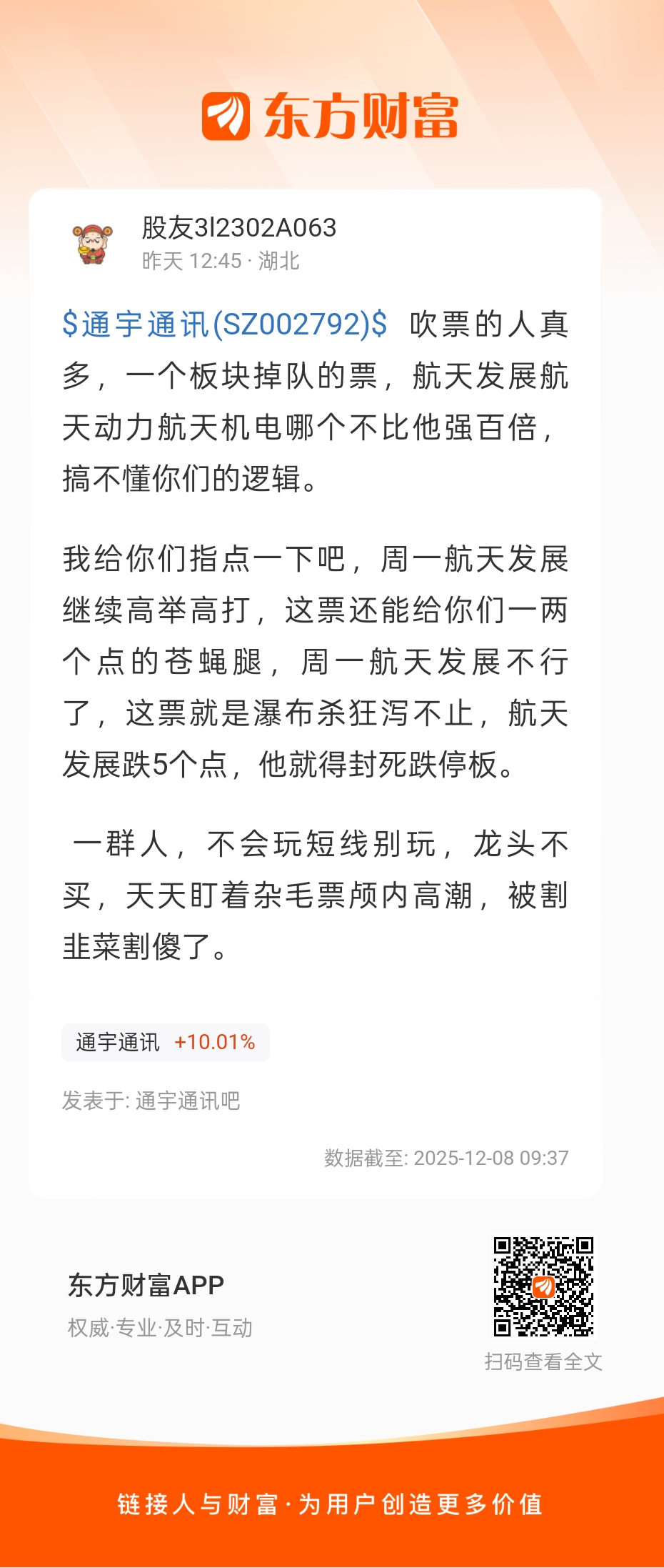 $通宇通讯(SZ002792)$ 吹票的人真多,一个板块掉队的票,航天发展航天动力航天机电哪个不比他强百倍,搞不懂你们的逻辑。