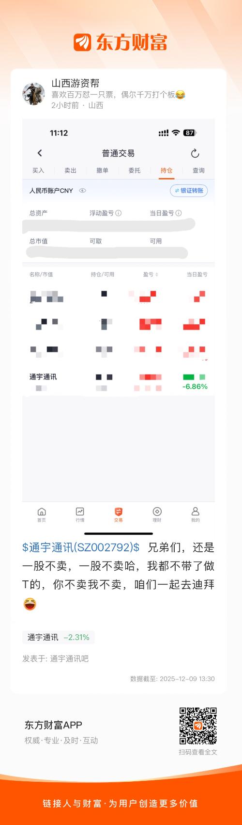 $通宇通讯(SZ002792)$  兄弟们,还是一股不卖,一股不卖哈,我都不带了做T的,你不卖我不卖,咱们一起去迪拜