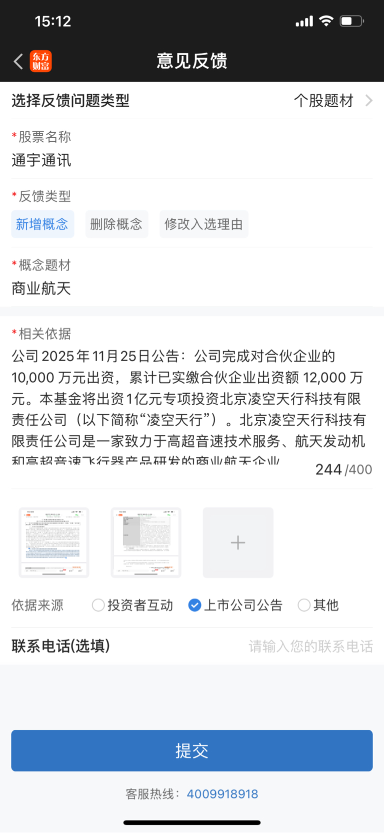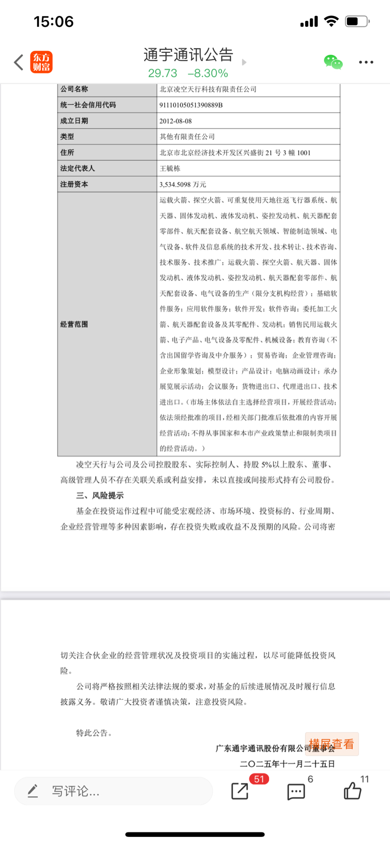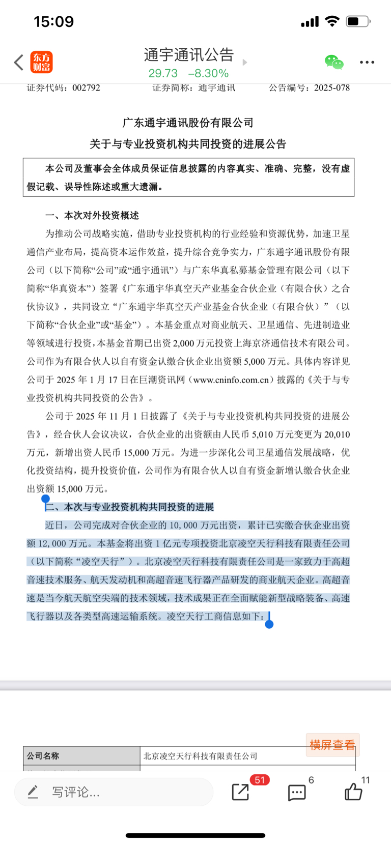 $通宇通讯(SZ002792)$ 11月25公告:公司完成对合伙企业的 10,000 万元出资,累计已实缴合伙企业出资额 12,000 万元。本基金将出资1亿元专项投资北京凌空天行科技有限责任公司(以下简称“凌空天行”)。北京凌空天行科技有限责任公司是一家致力于高超音速技术服务、航天发动机和高超音速飞行器产品研发的商业航天企业。