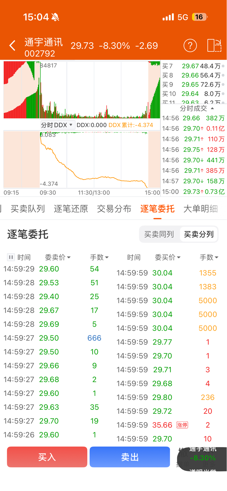 $通宇通讯(SZ002792)$ 尾盘搞这一手,还不是吃筹码,明天继续砸,今天拉高拉不起来被砸掉,我想这也是好事吧,毕竟次日的承接很难,明天再跌停得话就加仓,不跌停不动,今天被套了,明天就需要做T自救了。太伤了。