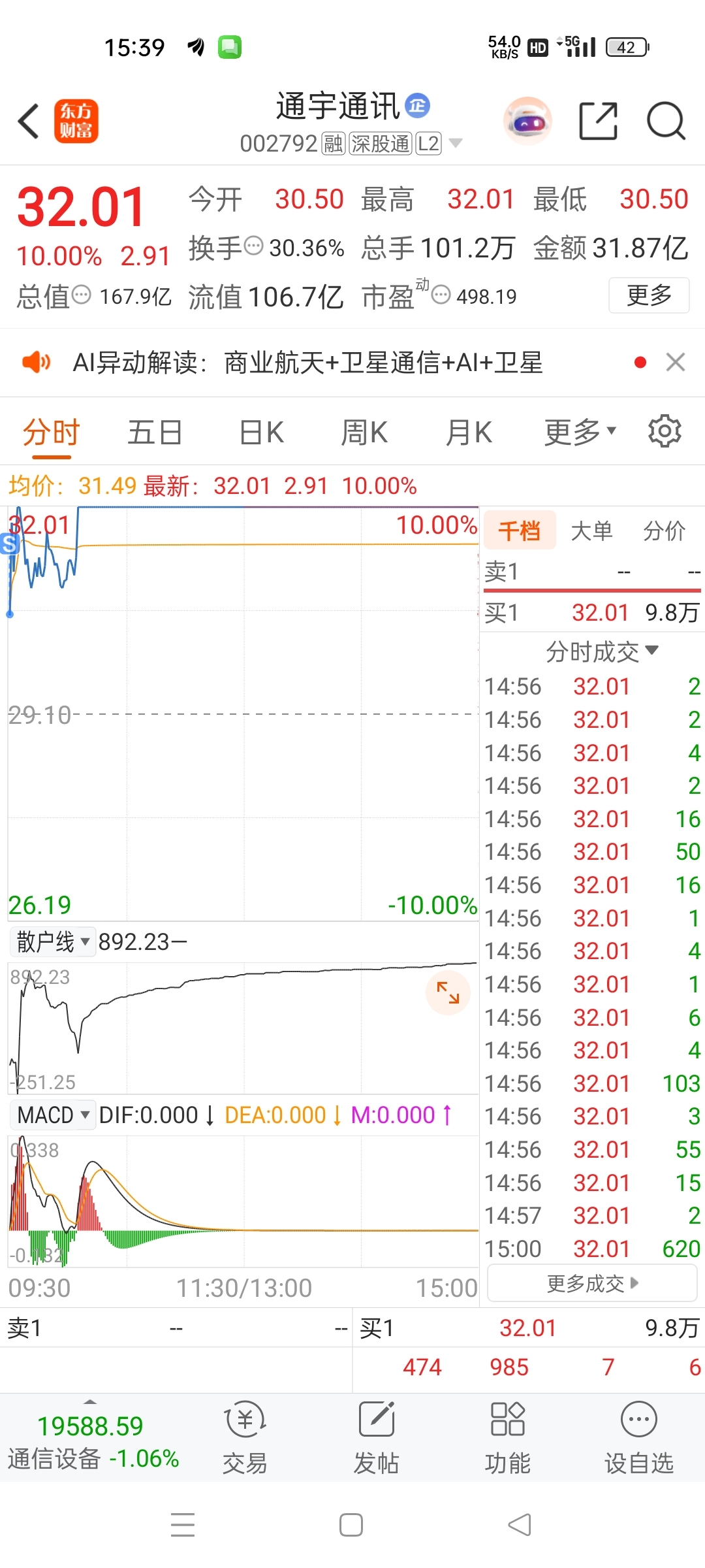 $通宇通讯(SZ002792)$ 不后悔,反正已赚8个点,周五28买的,竞价就走了,明天希望大涨,让兄弟们赚钱