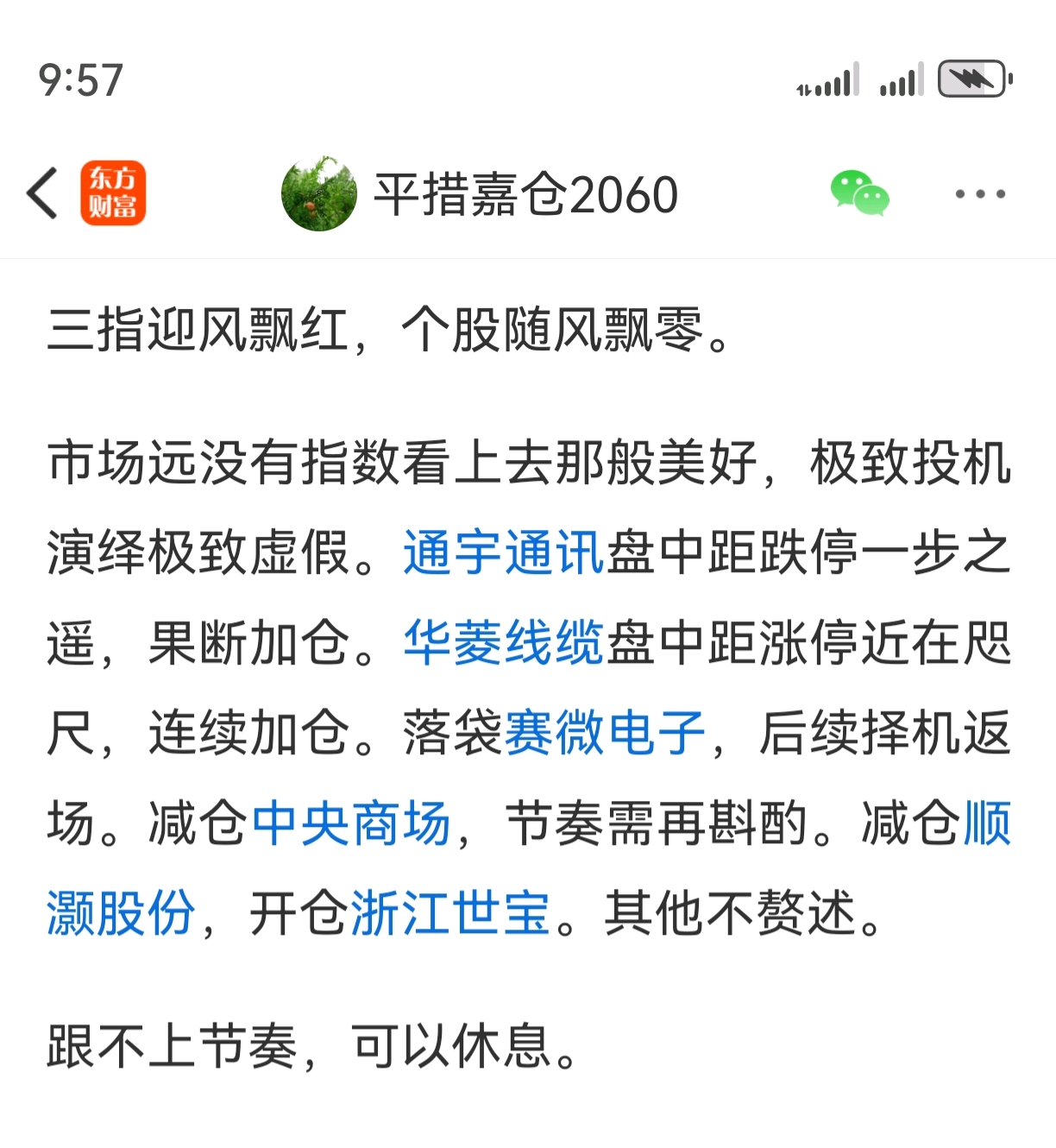 板块内切,高标反复。昨日跌停加重通宇通讯,今日水上5点将加仓悉数抛出。华菱线缆同频操作,完全打开浮盈。按预案加仓顺灏股份,承接中央商场。做替浙江世宝,开仓海科新源。挂低错失皮阿诺,回落试水奕东电子。其他不再赘述,盘中顺势而为。