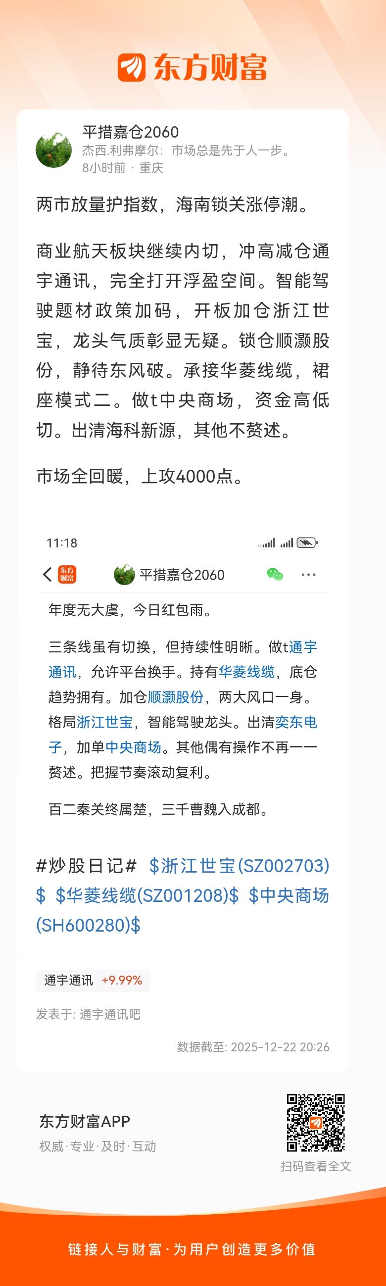 商业航天板块继续内切,冲高减仓通宇通讯,完全打开浮盈空间。智能驾驶题材政策加码,开板加仓浙江世宝,龙头气质彰显无疑。锁仓顺灏股份,静待东风破。承接华菱线缆,裙座模式二。做t中央商场,资金高低切。出清海科新源,其他不赘述。