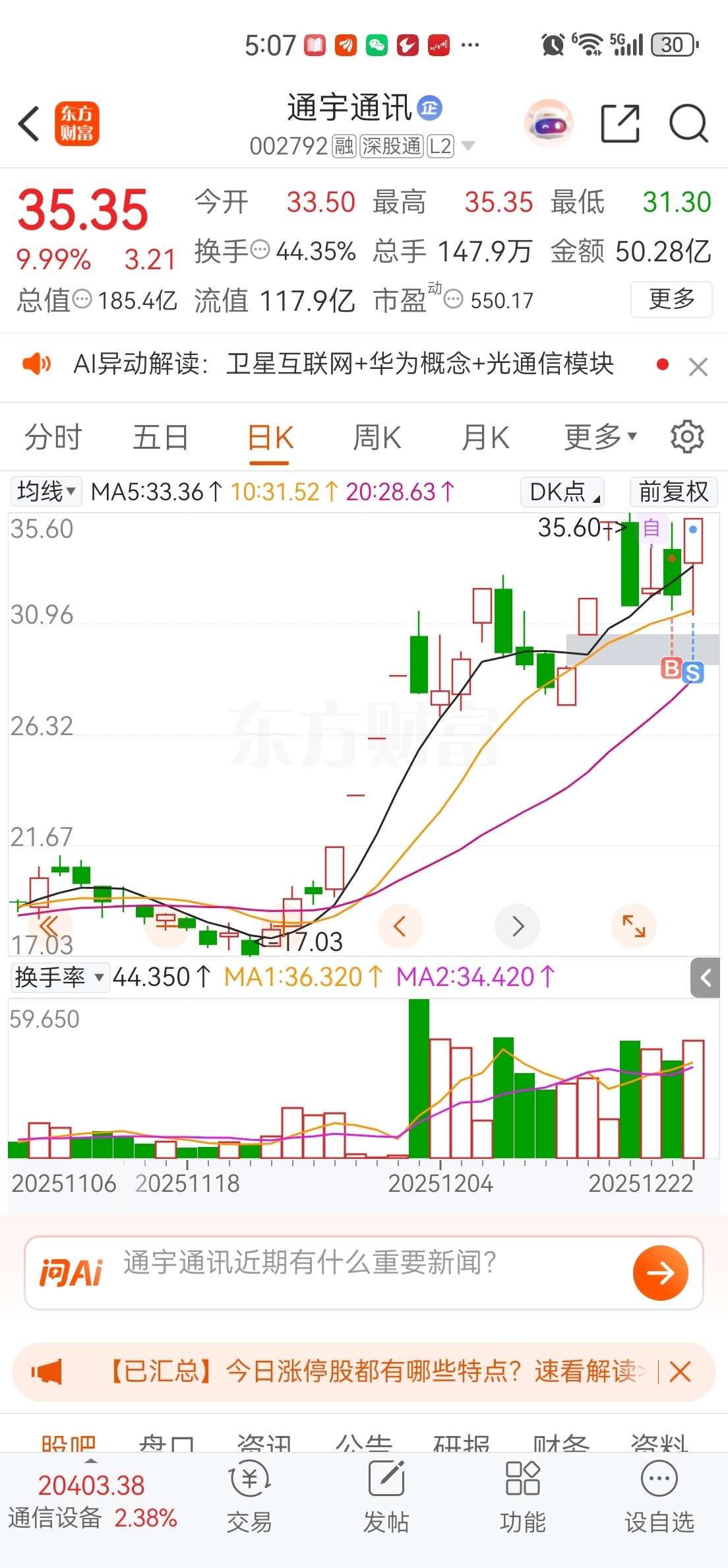 今天一开盘,通宇通讯直接低开,最低砸到31.30元,我盯着分时图,手心全是汗,心里直骂自己冲动,跟风果然没好下场。可就在我快要割肉的瞬间,股价突然被大资金拉起,一波直线拉升直接冲过均价线,接着更是扶摇直上,冲着涨停板去了!