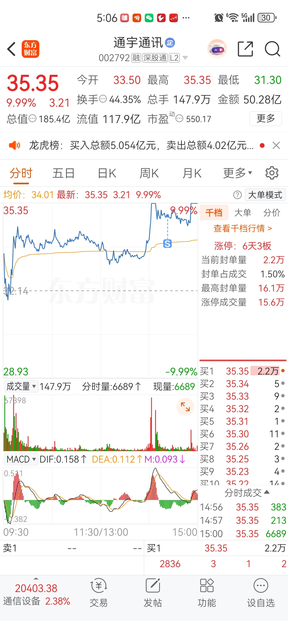 结果刚卖出,尾盘资金突然发力,直接把通宇通讯封死涨停,看着那牢牢封死的2.2万手封单,我拍断了大腿!这波操作,完美卖在黎明前,属实是被自己的心态坑了。