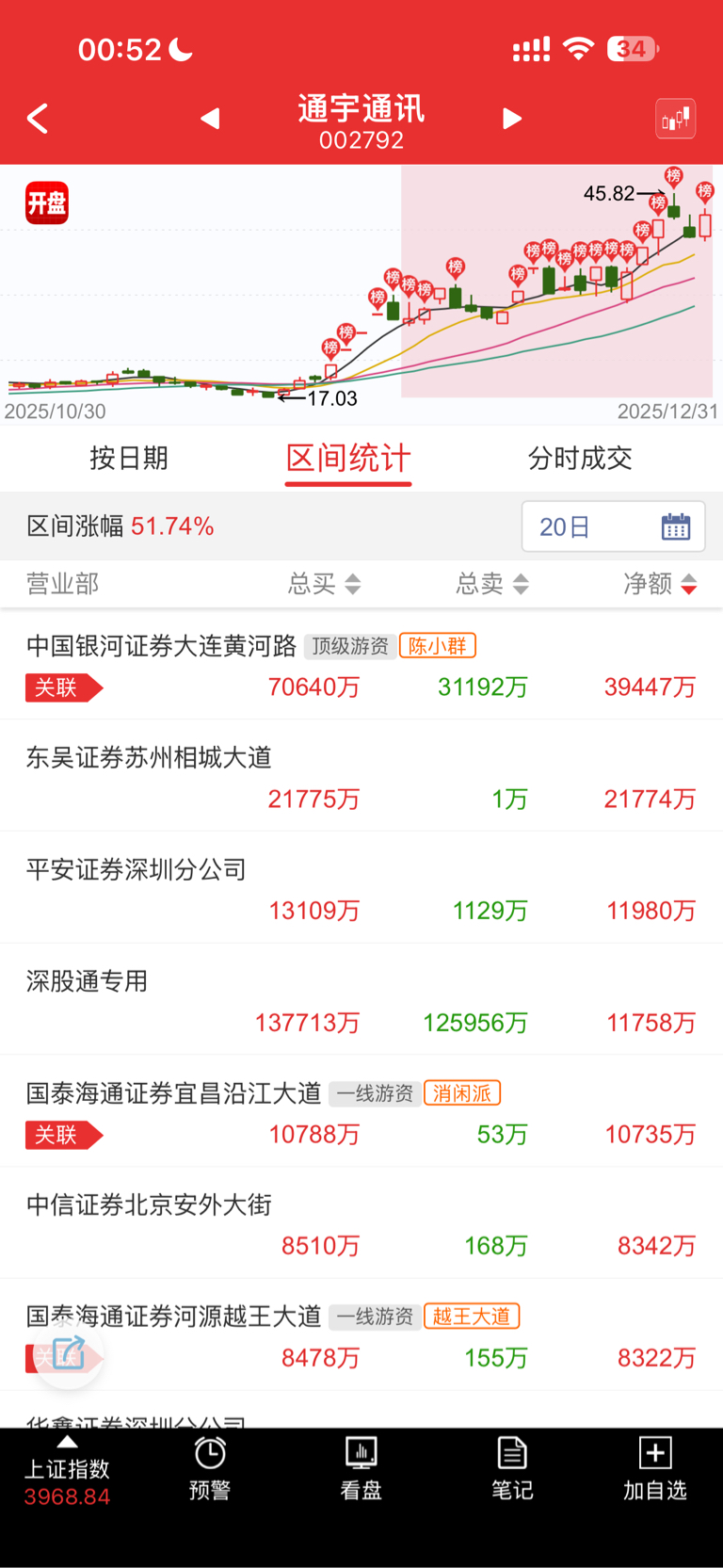 $通宇通讯(SZ002792)$ 从龙虎榜20日来看,大佬们都锁了,有没有卖就不知道了