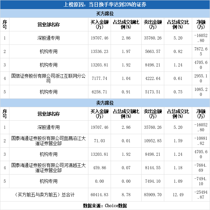 多主力现身龙虎榜,通宇通讯换手率达46.47%(01-05)