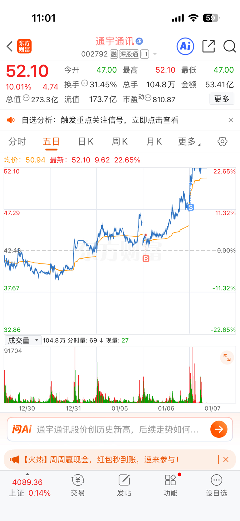 $通宇通讯(SZ002792)$ #炒股日记# 虽然没能拿到涨停,但是两天12个点已经很满意,感谢主力!