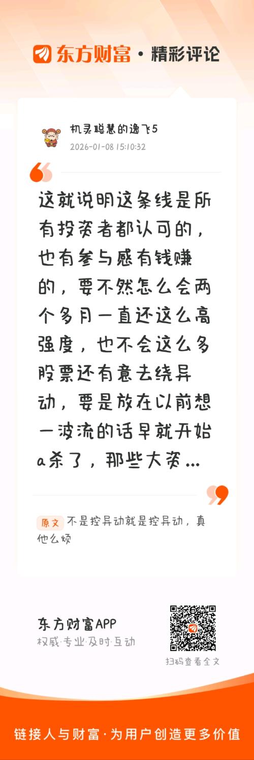 //@机灵聪慧的逸飞5 :这就说明这条线是所有投资者都认可的,也有参与感有钱赚的,要不然怎么会两个多月一直还这么高强度,也不会这么多股票还有意去绕异动,要是放在以前想一波流的话早就开始a杀了,那些大资金谁还花钱在这维持热度维持股价啊,急什么呢?大资金都不急,我们跟着赚钱的心态放平一点好了