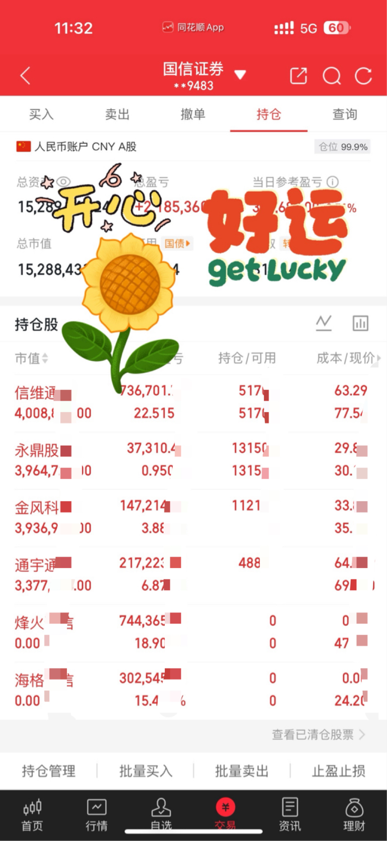 早盘介入$通宇通讯(SZ002792)$ 情绪修复,问题不大,多次逢低补仓的已经有益,看下午能否真正来个地天了。$金风科技(SZ002202)$ 低吸进场,稳健前行。
