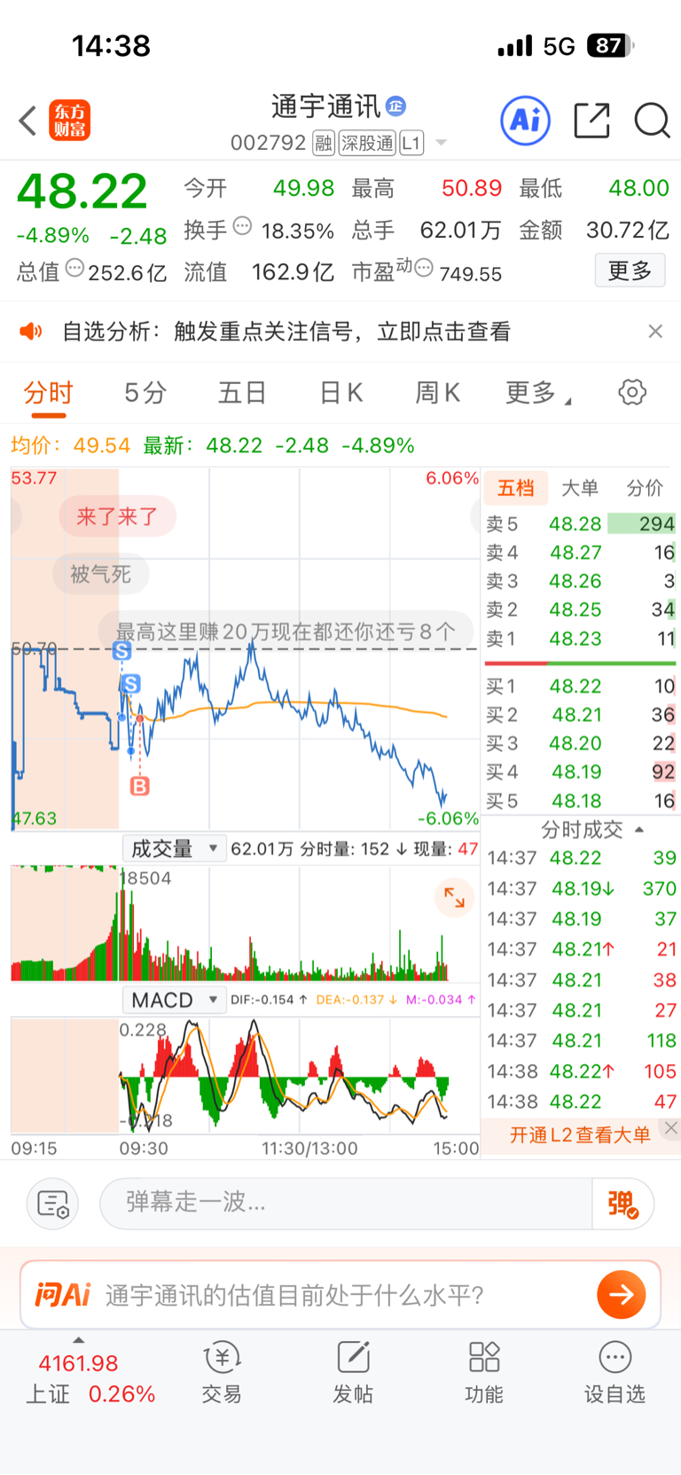 $通宇通讯(SZ002792)$ 两个批次止损单精准触发立马拉升,早上看航天普遍在修复立马纠错回来一点,奈何。。。继续磨吧