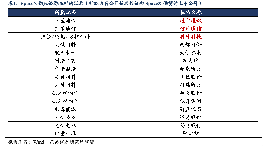 S链:Spacex供应链潜在标的汇总(标红为有公开信息验证向Spacex供货的上市公司)