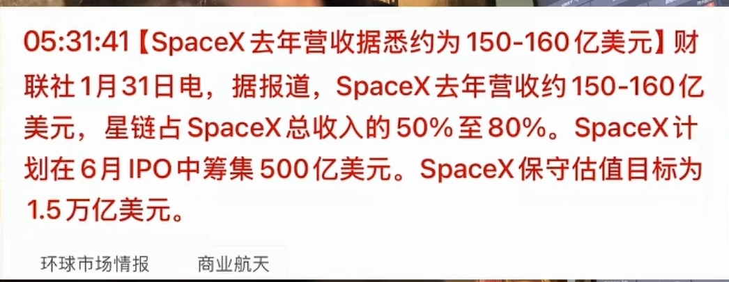 01.31(10:58)spacex出业绩了150-160亿美元,1150亿商业