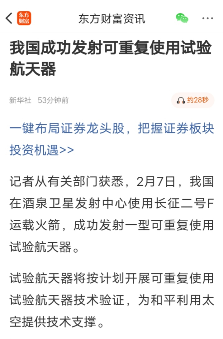 2月7日12:37,也就是刚刚,刚看到新华社出了“我国成功发射可重复使用试验航天