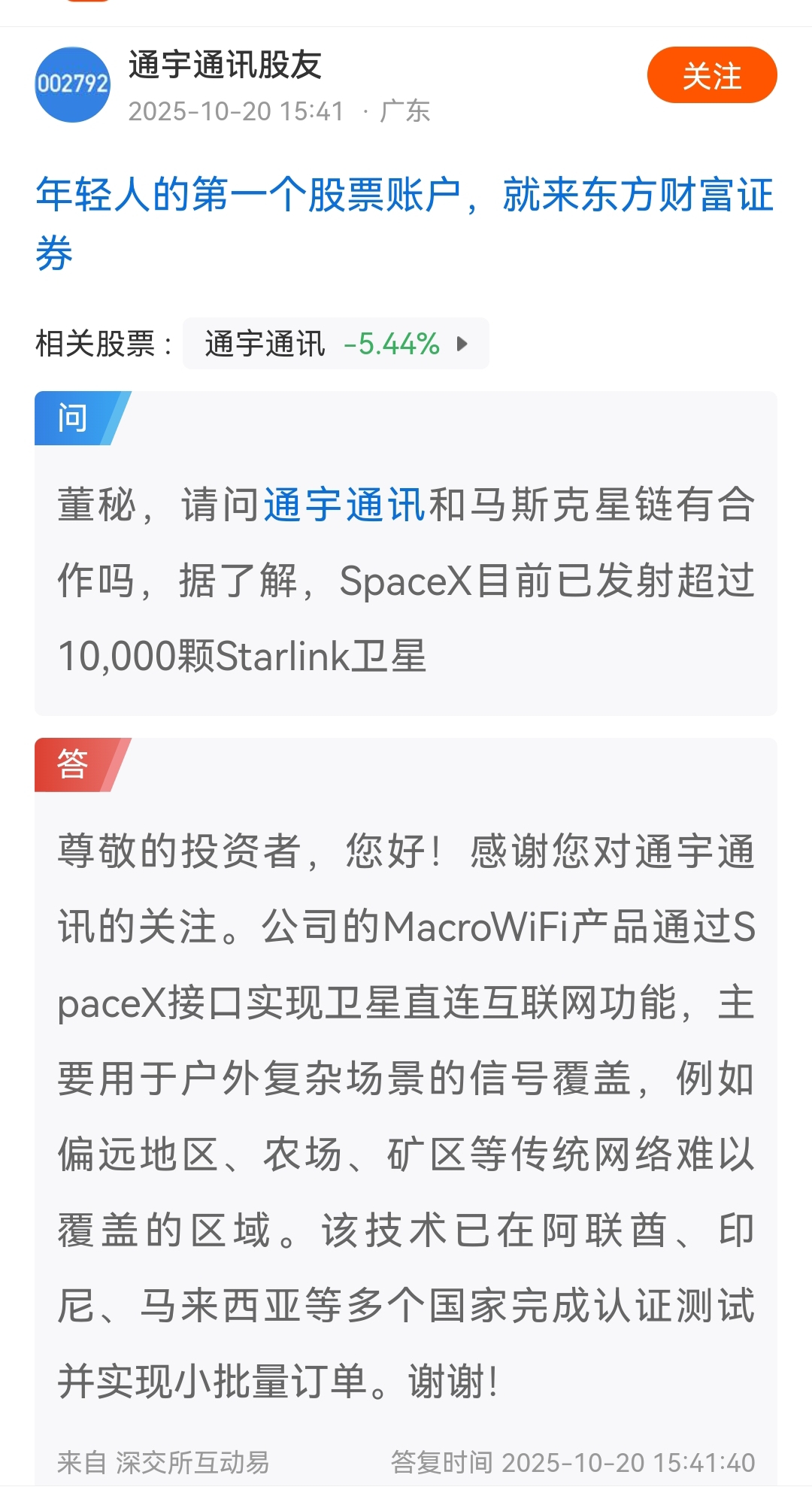 实锤,通宇通讯与马斯克的SpaceX存在业务合作,前者是后者的上游供应商