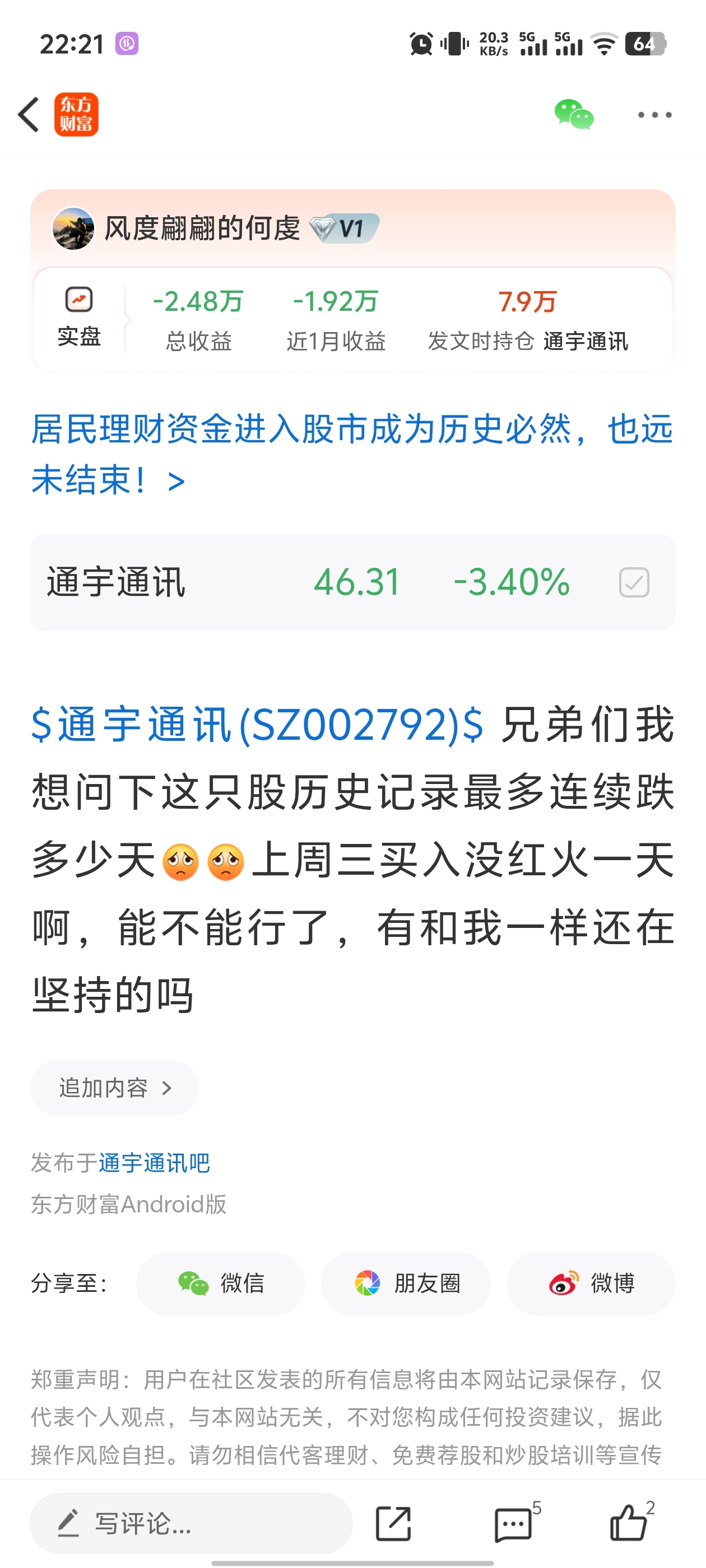 $通宇通讯(SZ002792)$ 年末了真心的问大家这个牛市你们都赚到钱了吗?我来晒一下总收益,负2.5个