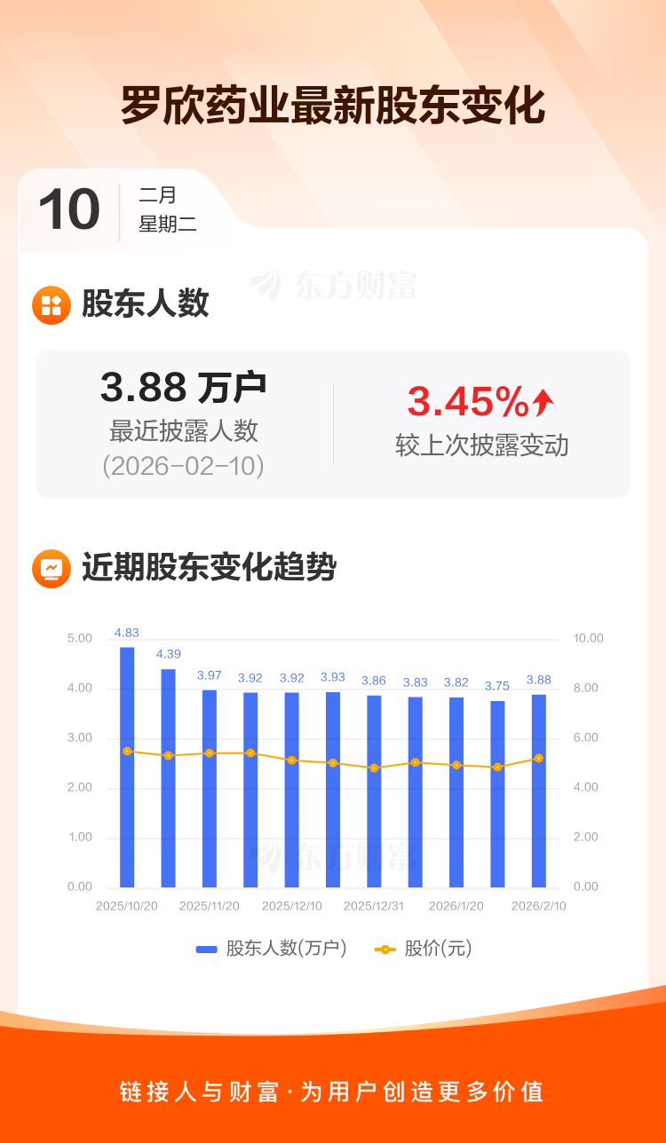 罗欣药业:截至2月10日最新股东户数3.88万户,较上期增加3.45%