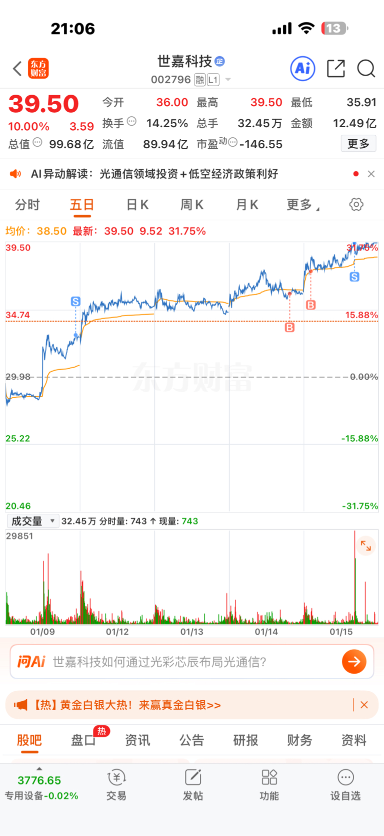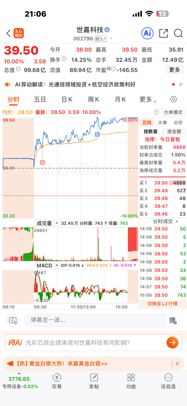 $世嘉科技(SZ002796)$ 上周涨停卖了,这周3天错过了七八个点,昨天尾盘买回1000股,今日盘中37.49元又加仓1000股,39.49元S掉,做T盈利2K。今日靠世嘉弥补了,岩山的核按钮,今日加仓正确,收盘账户还红1400多。看好世嘉科技短期上50元