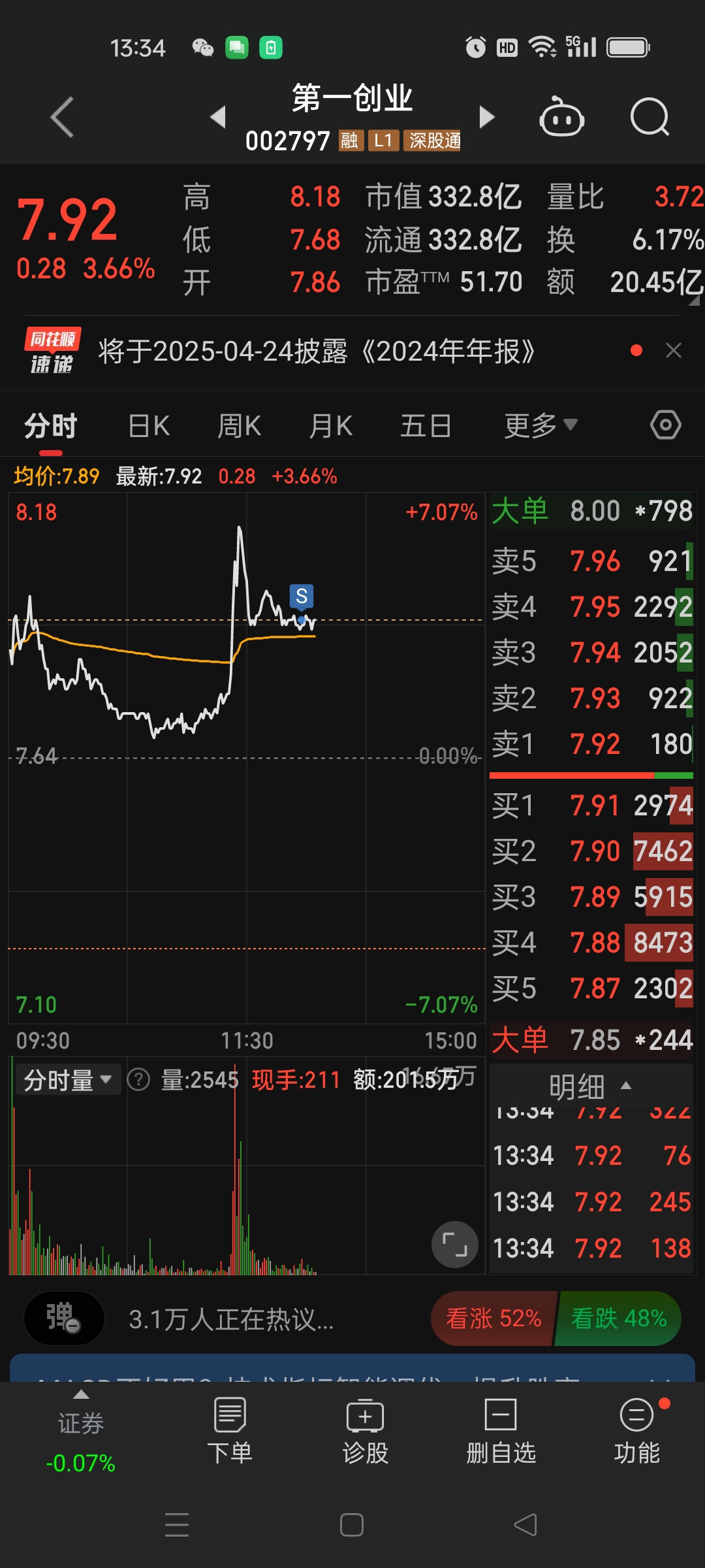 $第一创业(SZ002797)$ 7.92走一部分