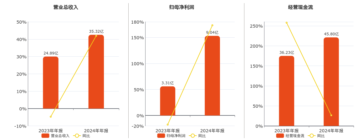 公司营业总收入为35.32亿元,较去年同报告期营业总收入增加10.43亿元,同比较去年同期上涨41.91%。归母净利润为9.04亿元,较去年同报告期归母净利润增加5.73亿元,同比较去年同期上涨173.28%。经营活动现金净流入为45.80亿元,较去年同报告期经营活动现金净流入增加9.57亿元,实现2年连续上涨,同比较去年同期上涨26.42%。