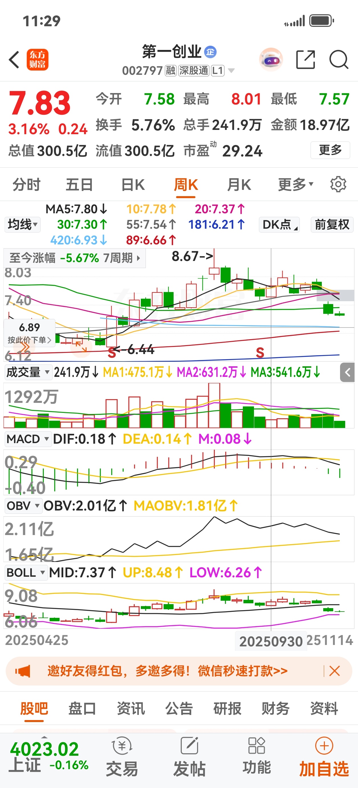 $第一创业(SZ002797)$ 周线6.88处有支撑!但不是强支撑,有可能去6.50元以下!