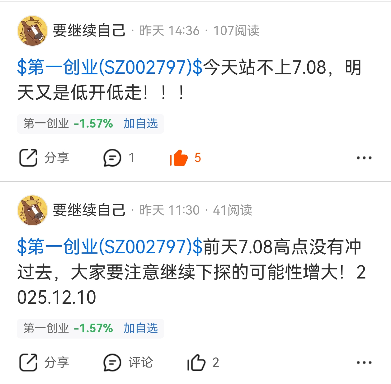 $第一创业(SZ002797)$ 昨天 7.08 没过,今天铁定要低开低走!下周继续破偏低!