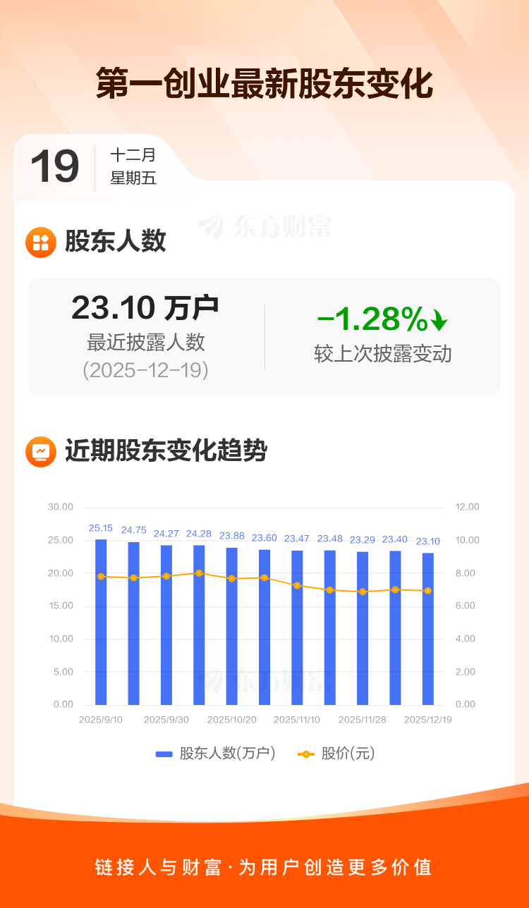第一创业最新披露数据显示,截至12月19日公司股东户数为23.10万户,较上期(2025年12月10日)减少3004户,降幅为1.28%。户均持有流通股数量由上期的1.80万股上升至1.82万股,户均持股金额由上期的12.59万元增加至12.63万元。
