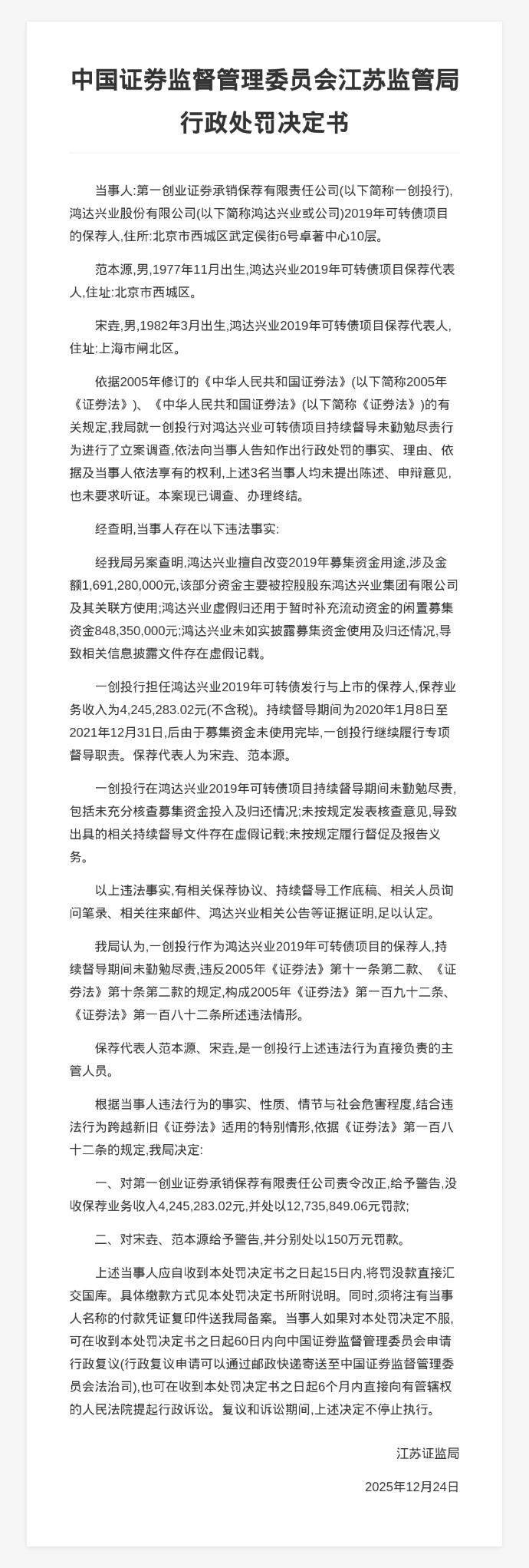 针对以上问题,江苏证监局决定对第一创业证券承销保荐有限责任公司责令改正,给予警告,没收保荐业务收入4,245,283.02元,并处以12,735,849.06元罚款;对宋垚、范本源给予警告,并分别处以150万元罚款。