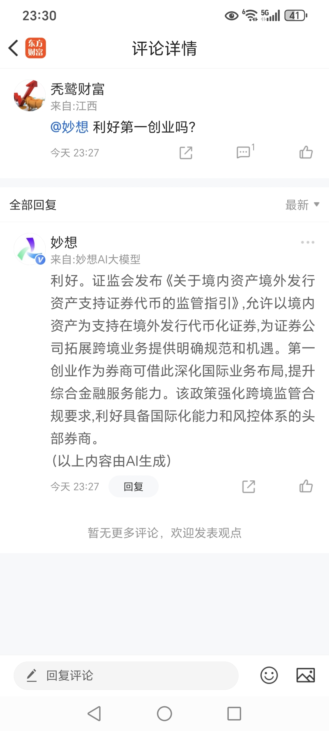 $第一创业(SZ002797)$ 利好第一创业。2026年2月6日晚,证监会发布《关于境内资产境外发行资产支持证券代币的监管指引》,允许以境内资产为支持在境外发行代币化证券,为证券公司拓展跨境业务提供明确规范和机遇。第一创业作为券商可借此深化国际业务布局,提升综合金融服务能力。该政策强化跨境监管合规要求,利好具备国际化能力和风控体系的头部券商。(以上内容由AI生成)