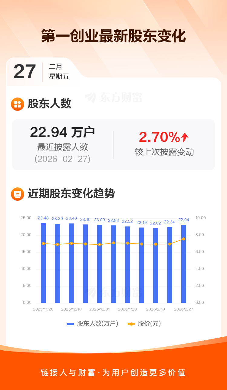 第一创业最新披露数据显示,截至2月27日公司股东户数为22.94万户,较上期(2026年2月13日)增加6032户,增幅为2.70%。户均持有流通股数量由上期的1.88万股下降至1.83万股,户均持股金额由上期的13.04万元增加至13.79万元。
